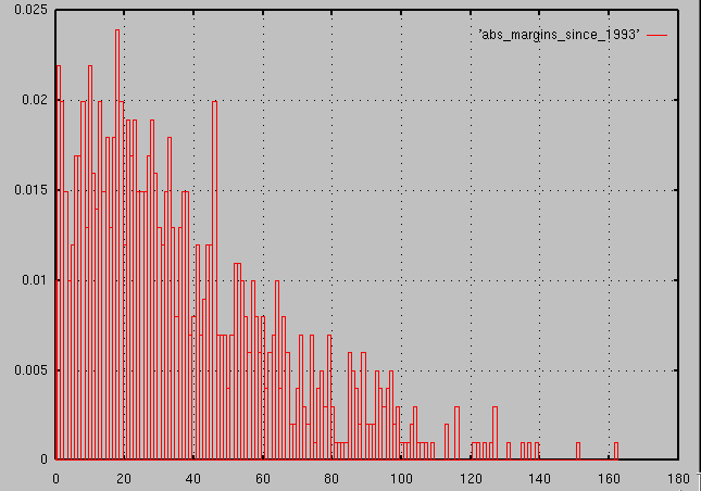 This is a histogram of the winning margin of the last 1000 matches (1993 to start of 1999 season) of AFL football. The histogram has statistics mu=36.6 and sigma=45.3.