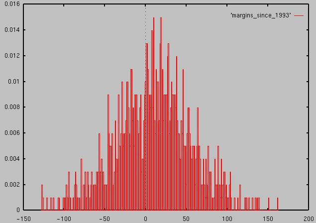 This is a histogram of the winning margin relative to the home team of about last 1000 matches (1993 to start of 1999 season) of AFL football. ie. if it was Richmond vs Sydney at the MCG, and Sydney won, that would be a negative winning margin (relative to Richmond). The histogram has statistics mu=9.8 sigma=45.3.